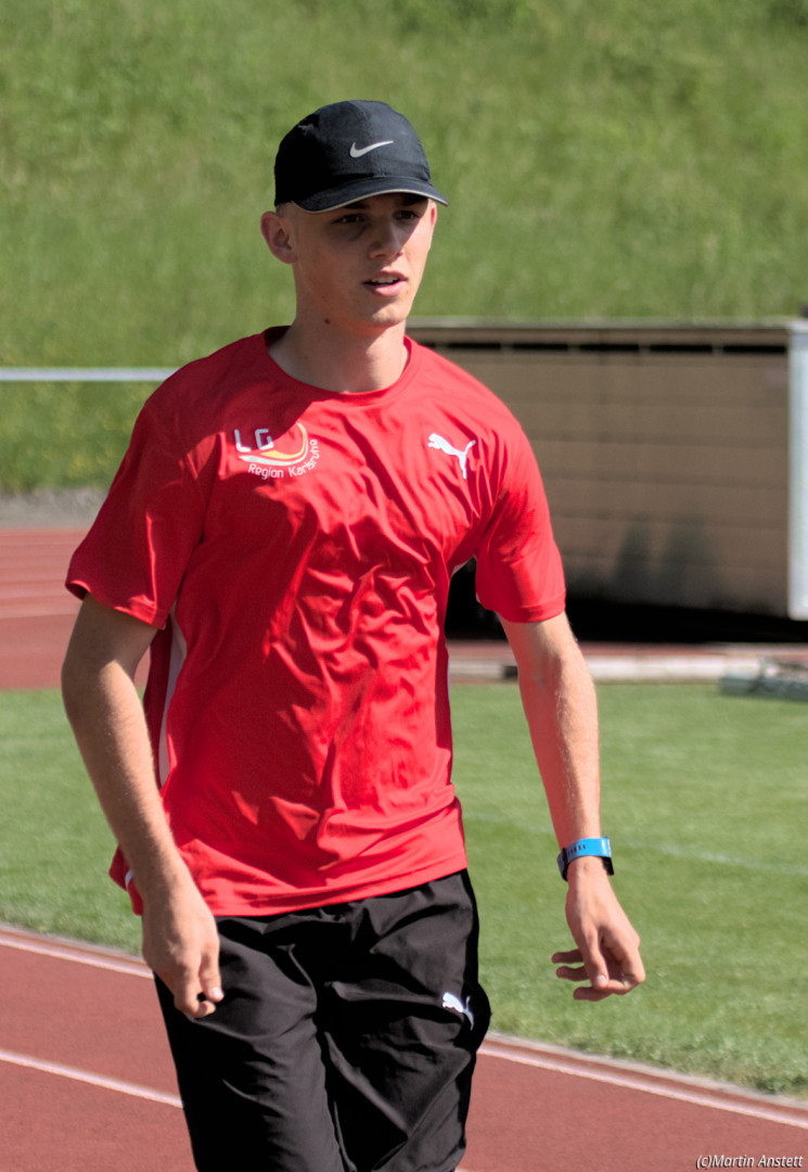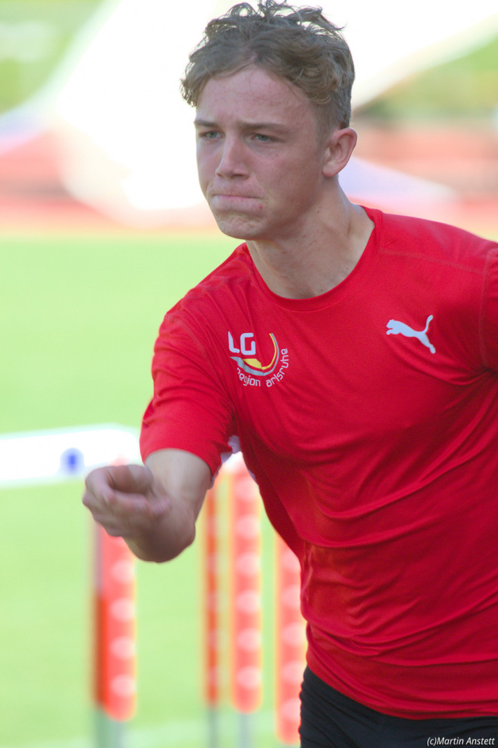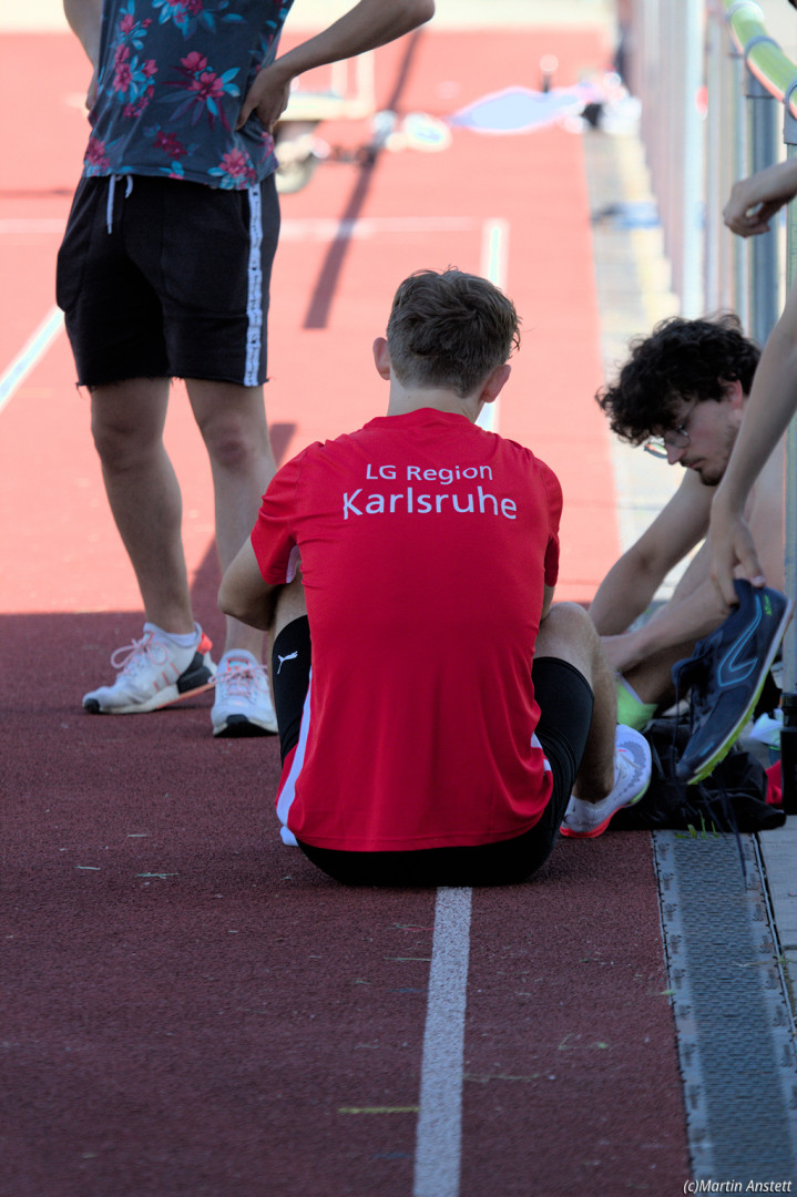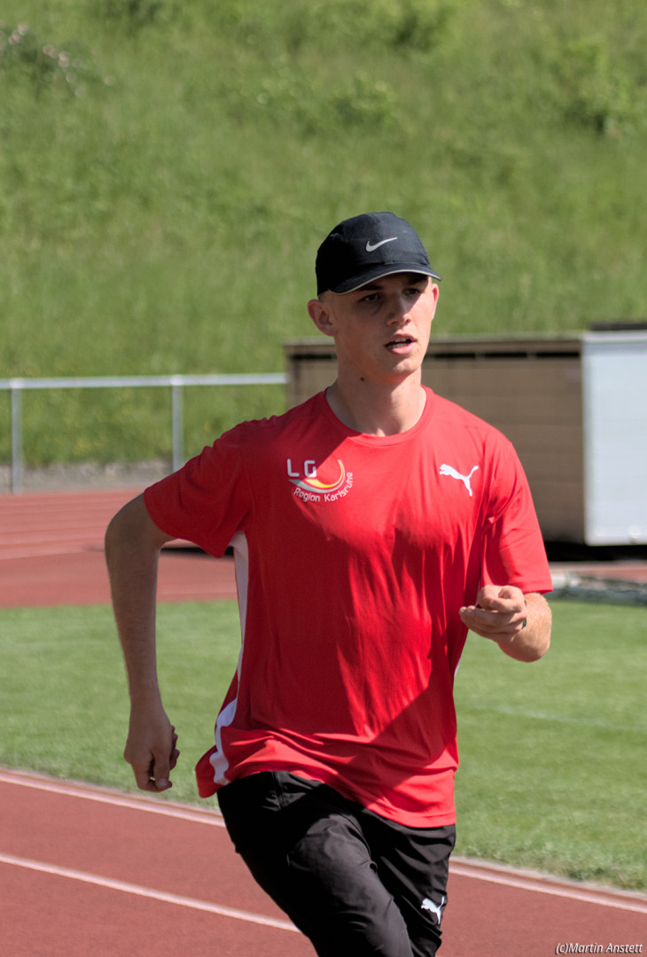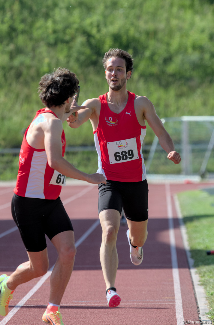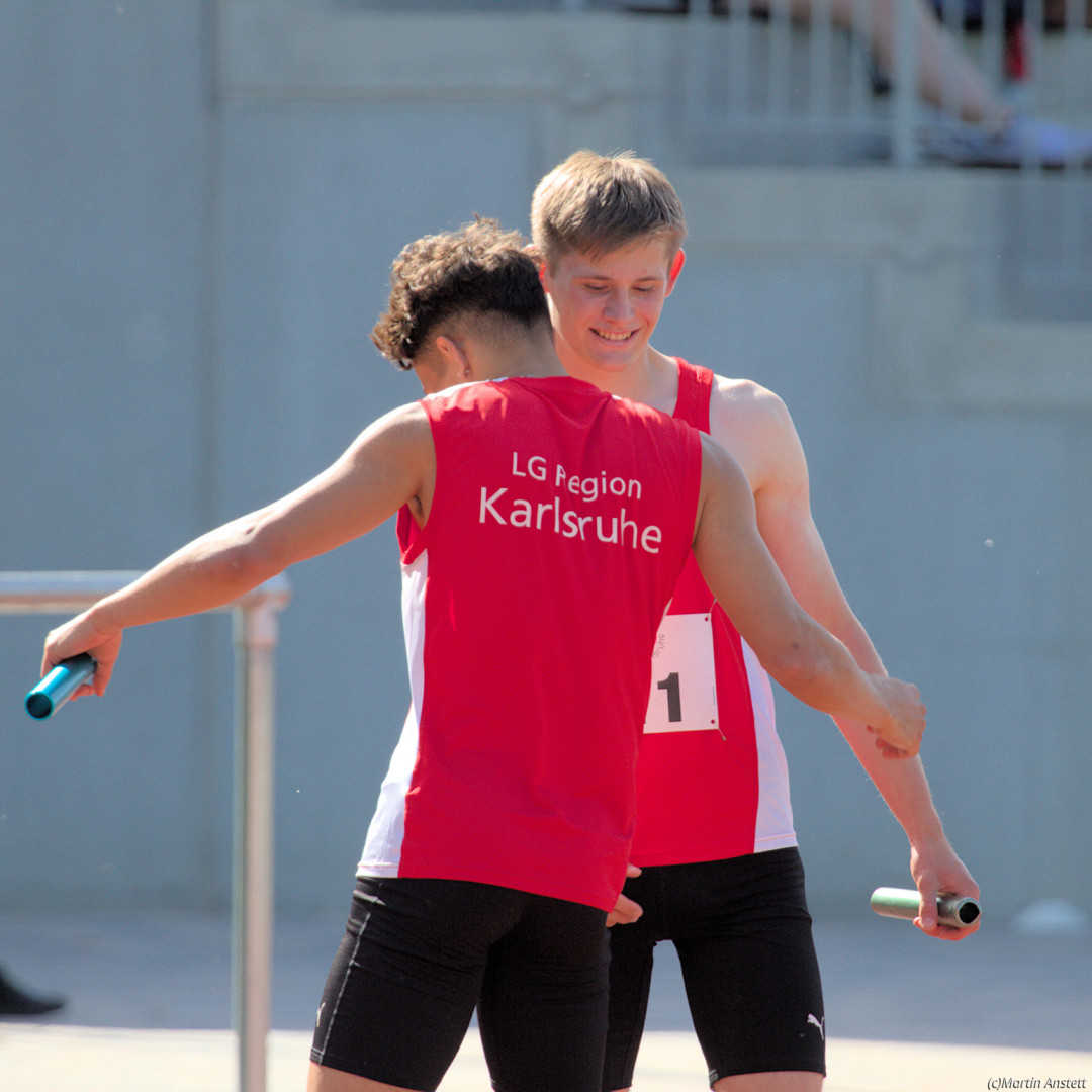 In der U20-Mannschaft der LG Region Karlsruhe bringt Tim Anstett als jüngster Starter die Staffel als Schlussläufer ins Ziel.