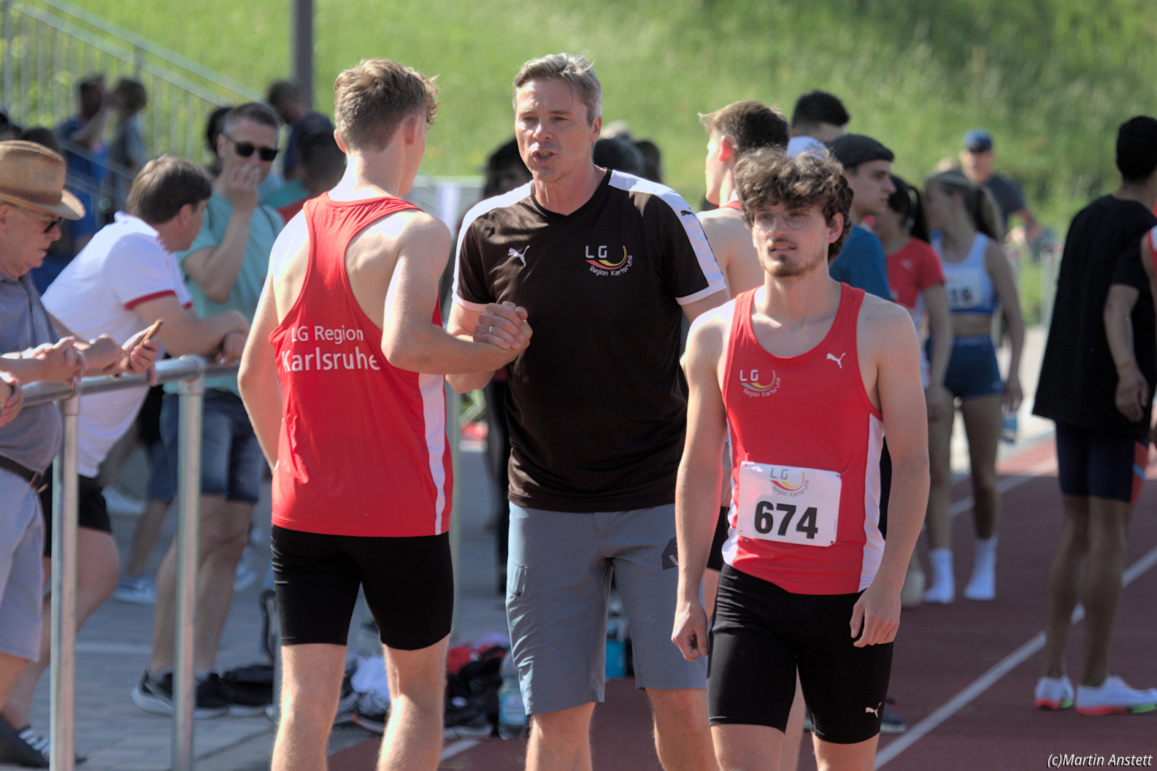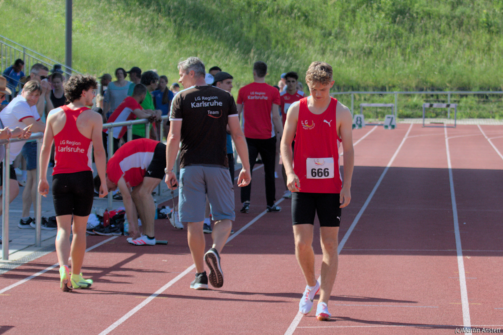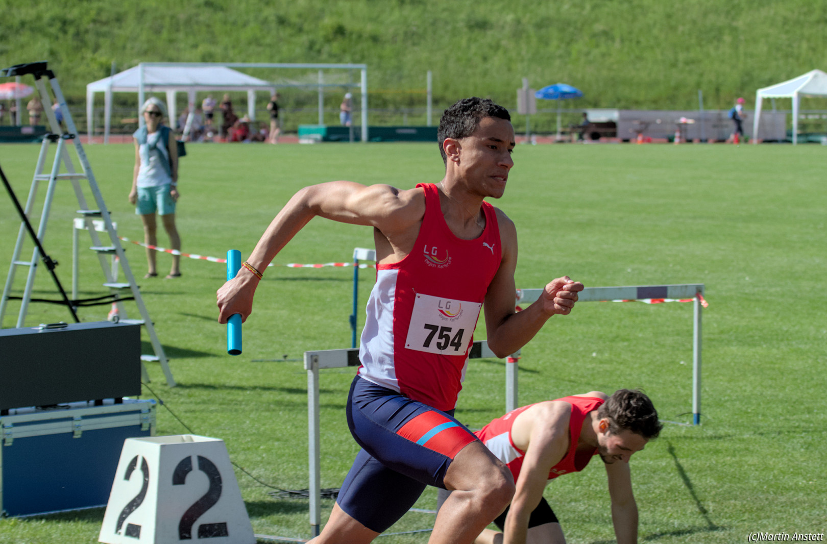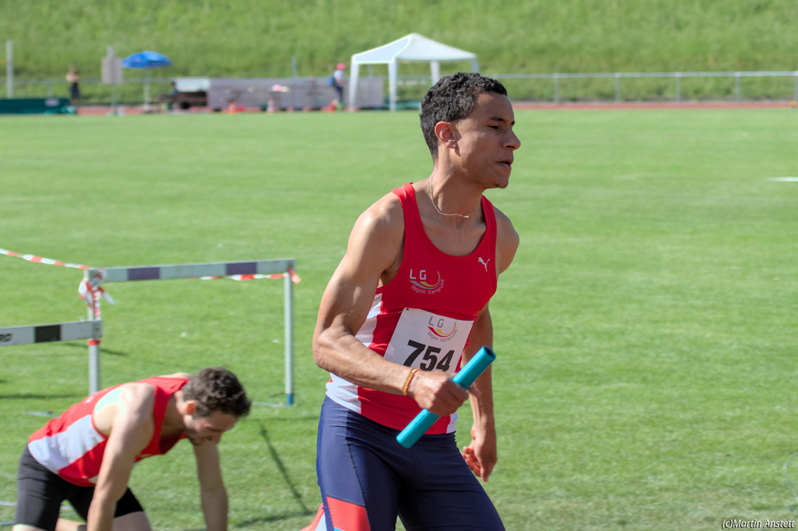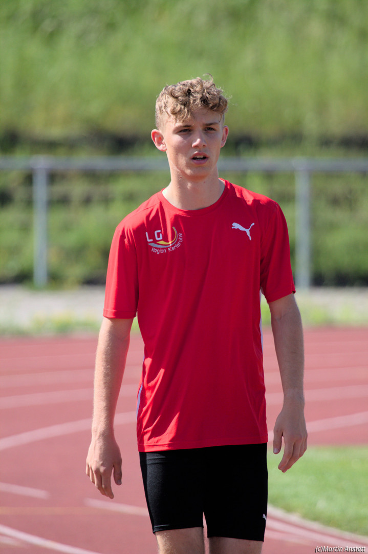 In der U20-Mannschaft der LG Region Karlsruhe bringt Tim Anstett als jüngster Starter die Staffel als Schlussläufer ins Ziel.