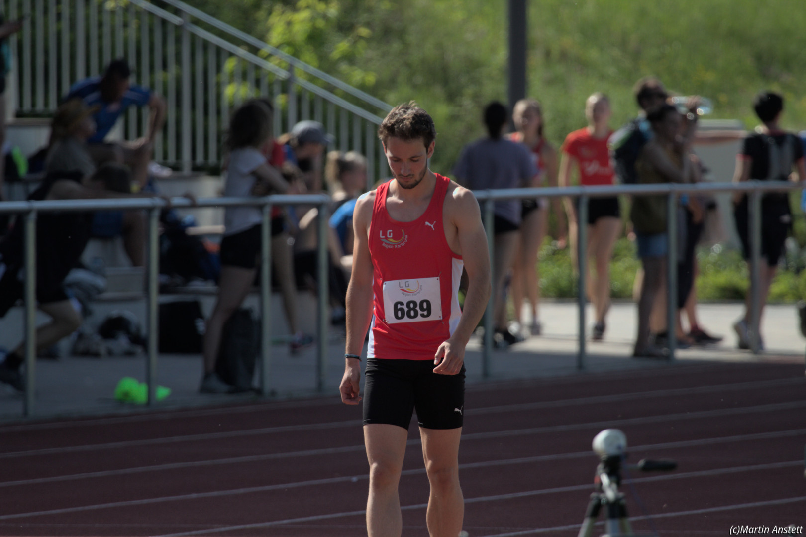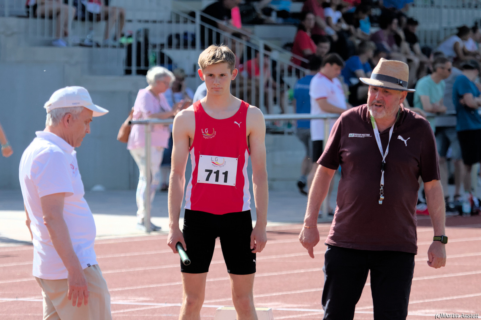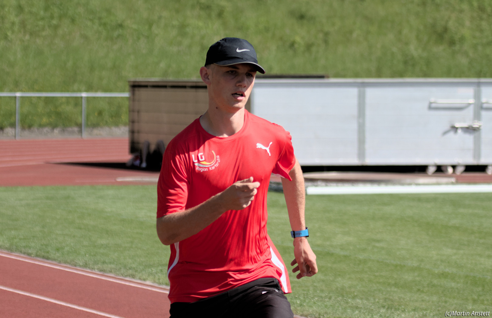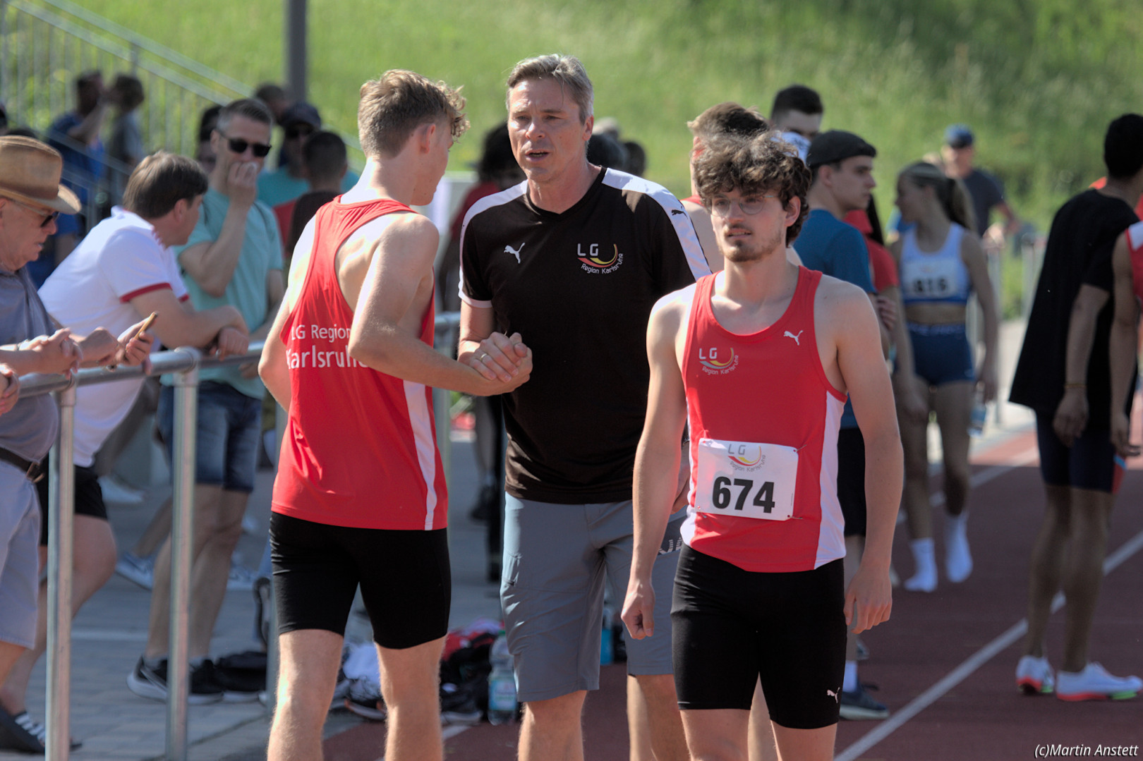 In der U20-Mannschaft der LG Region Karlsruhe bringt Tim Anstett als jüngster Starter die Staffel als Schlussläufer ins Ziel.