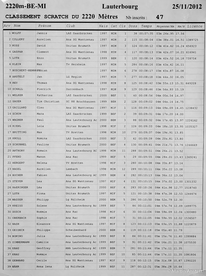 Im französischen Lauterbourg wartete der bekannt selektive Cross über 2220m auf die beiden gestarteten Jungs aus der Laufgruppe der LG Region Karlsruhe. Gegen starke Konkurrenz aus Frankreich, Pfalz und dem Saarland liefen Fabian Boschert-Hennrich und Jan Anstett ein schnelles Rennen. Dabei hatte diesmal Fabian die Nase vorn und kam eine Sekunde vor Jan auf dem 6-ten Platz ins Ziel. (8:18min bzw. 8:17min)