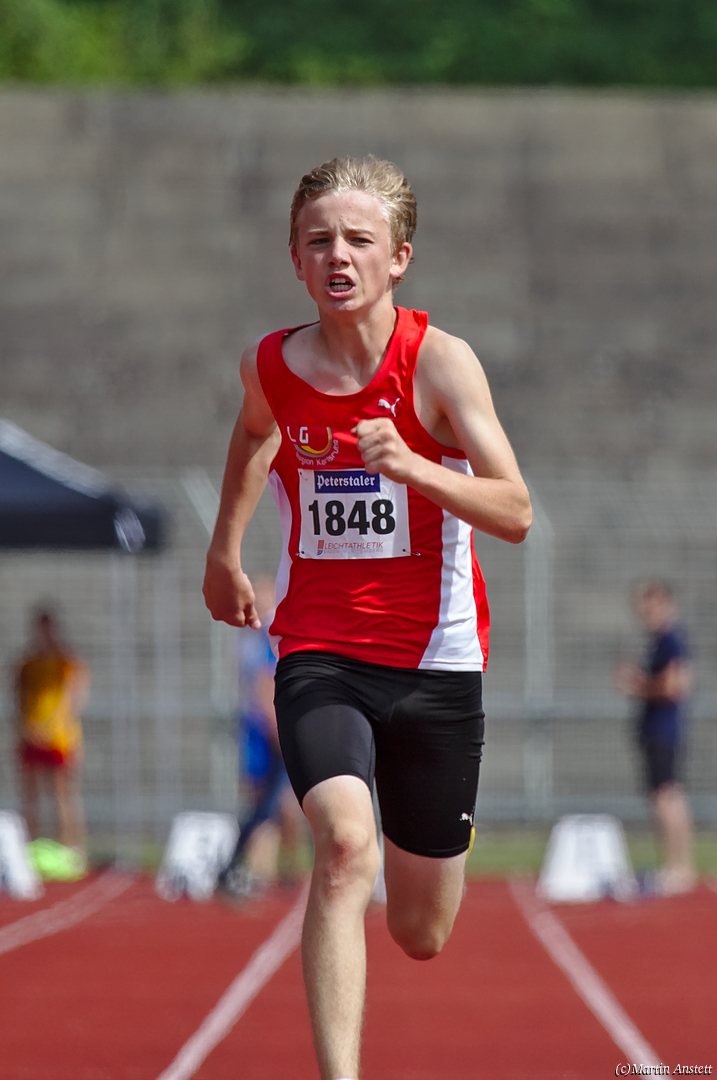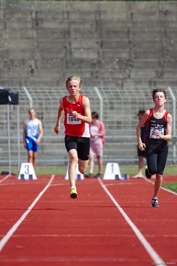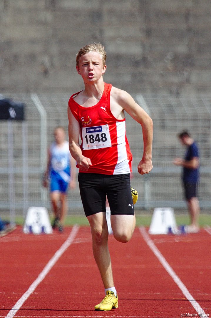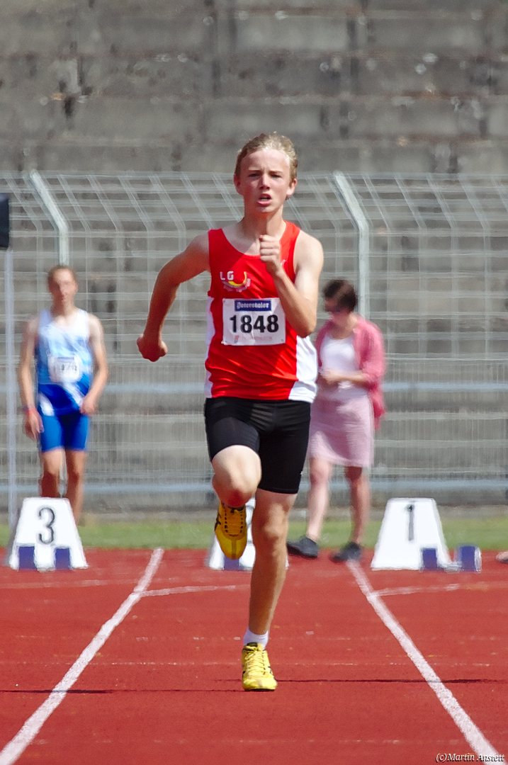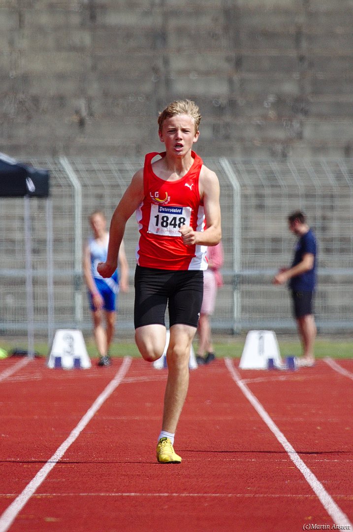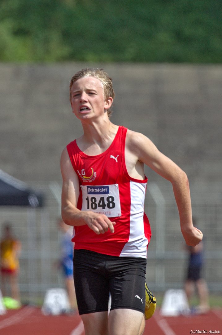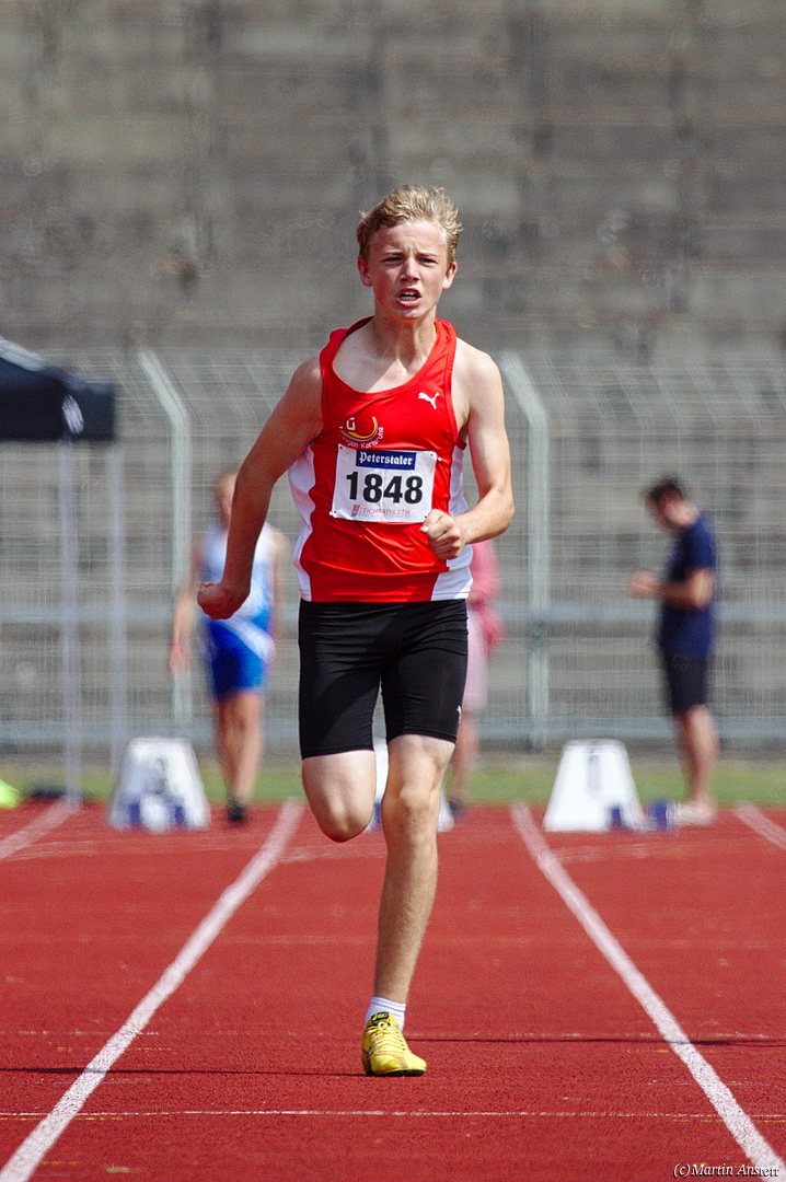 Tim lieferte gegen den sprintstarken Luca Largé der MTG Mannheim einen tollen Wettkampf, in dem er in jeder der 5 Disziplinen eine neue persönliche Bestleistung aufstellte. Ganz stark war dabei seine Zeit über die 80m Hürden (12,28sec), sowie die im Alleingang von der Spitze weg gelaufenen 6:44,20min über die abschliessenden 2000m. Am Ende eines in jeder Hinsicht heißen Tages bedeutete das 2.460 Punkte und die Silbermedaille im Blockwettkampf Lauf der M14.
