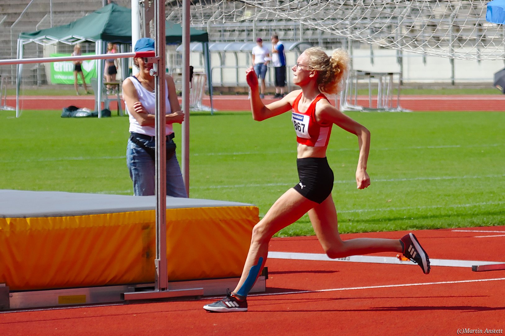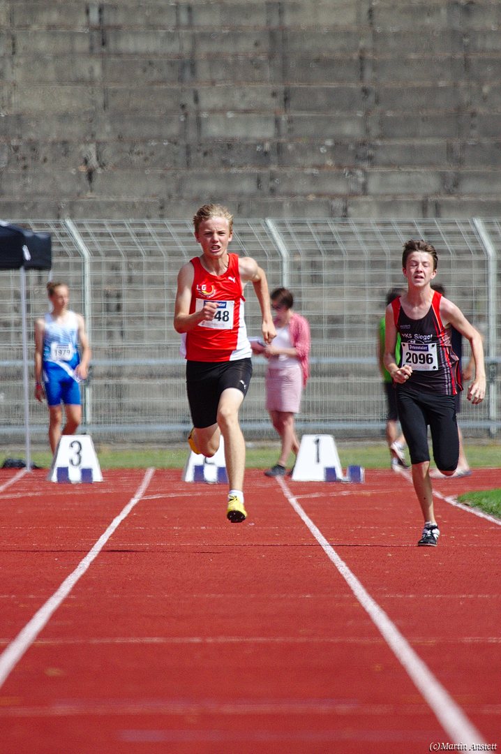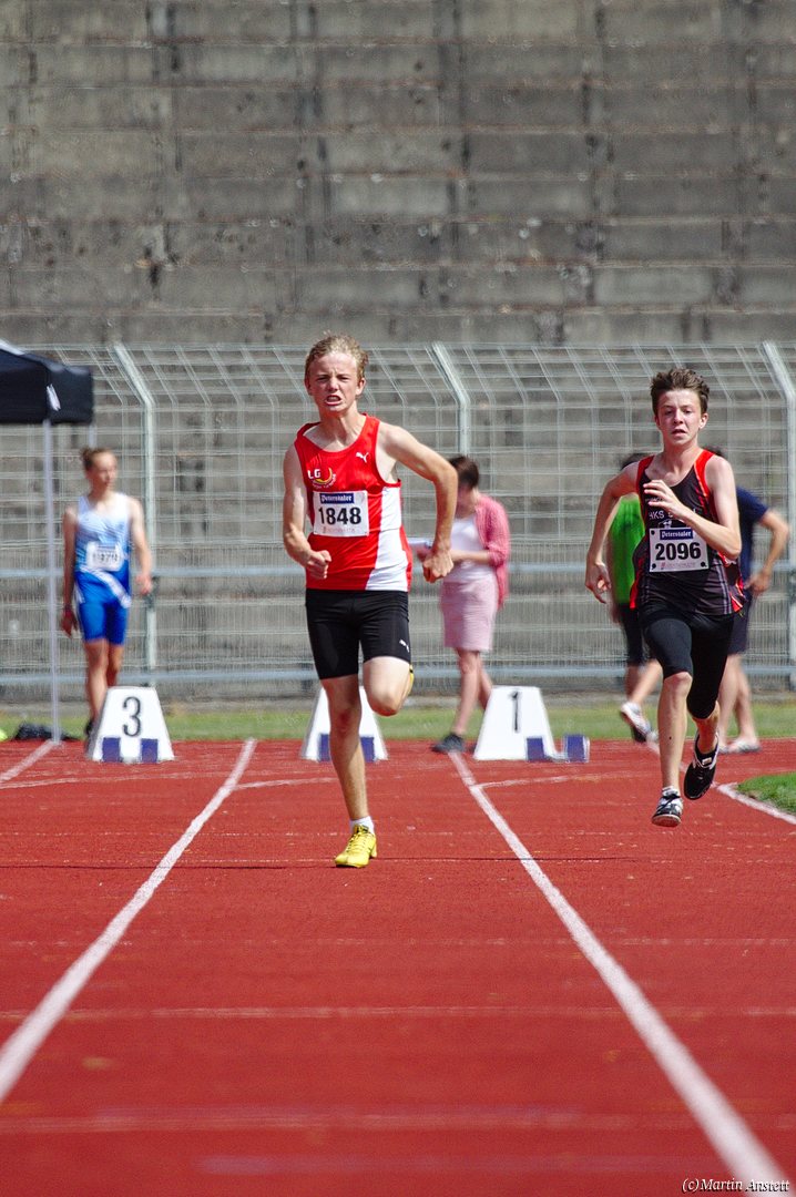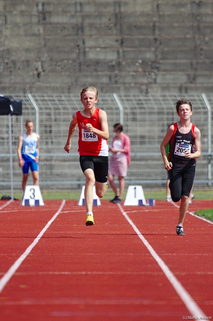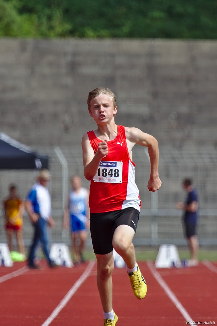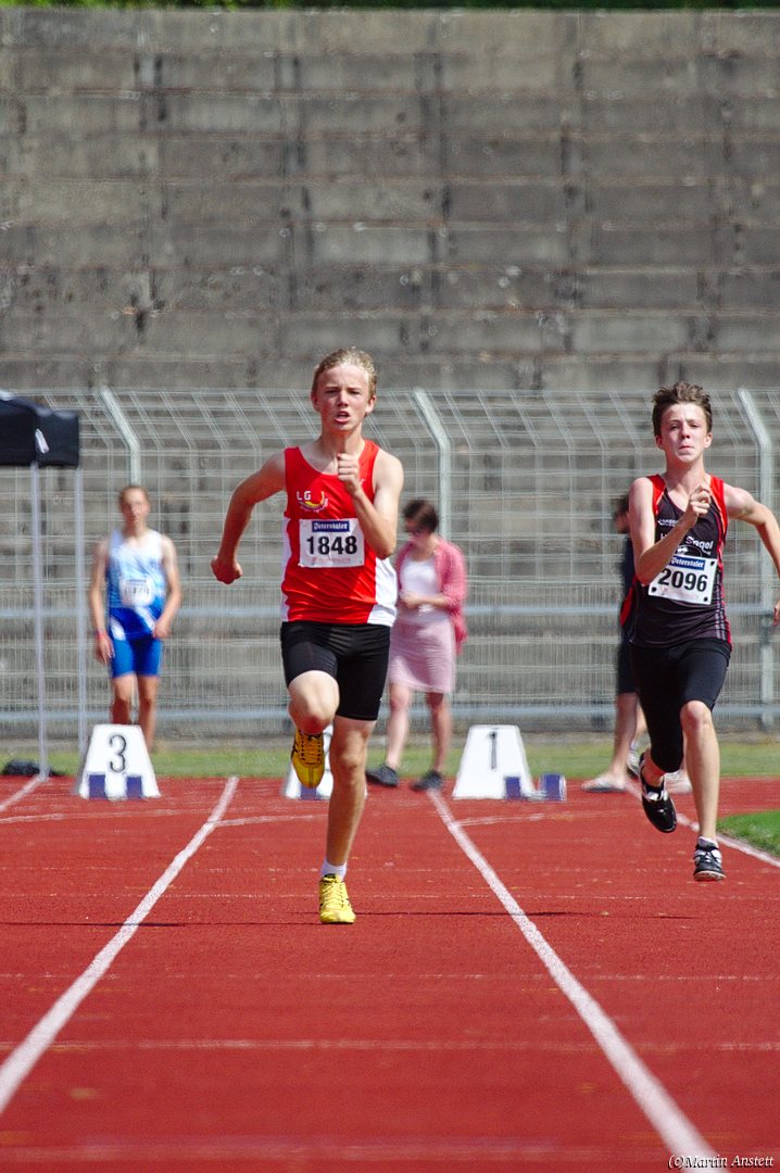 Tim lieferte gegen den sprintstarken Luca Largé der MTG Mannheim einen tollen Wettkampf, in dem er in jeder der 5 Disziplinen eine neue persönliche Bestleistung aufstellte. Ganz stark war dabei seine Zeit über die 80m Hürden (12,28sec), sowie die im Alleingang von der Spitze weg gelaufenen 6:44,20min über die abschliessenden 2000m. Am Ende eines in jeder Hinsicht heißen Tages bedeutete das 2.460 Punkte und die Silbermedaille im Blockwettkampf Lauf der M14.