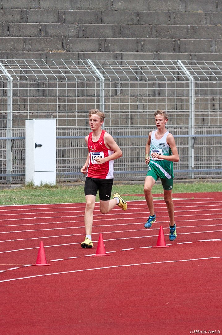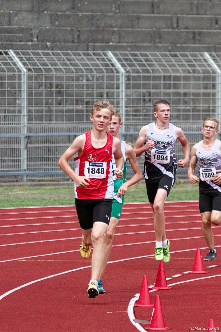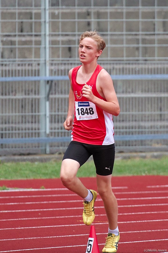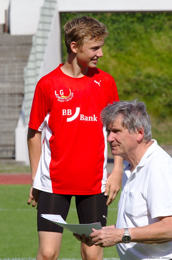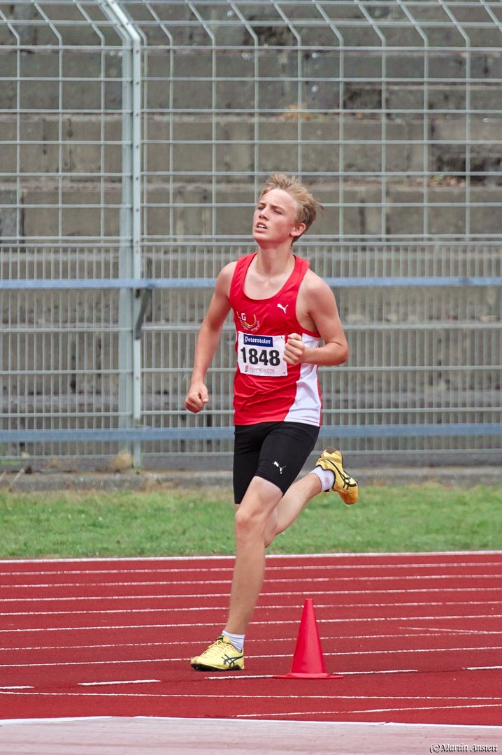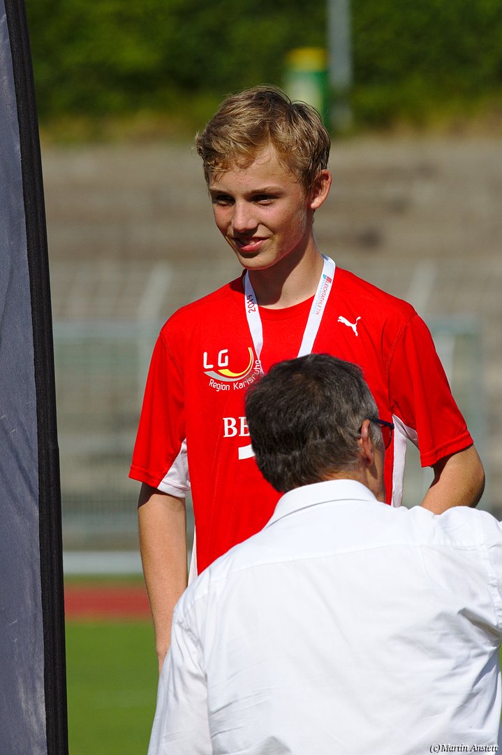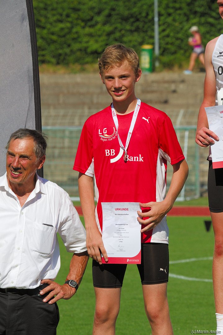 Tim lieferte gegen den sprintstarken Luca Largé der MTG Mannheim einen tollen Wettkampf, in dem er in jeder der 5 Disziplinen eine neue persönliche Bestleistung aufstellte. Ganz stark war dabei seine Zeit über die 80m Hürden (12,28sec), sowie die im Alleingang von der Spitze weg gelaufenen 6:44,20min über die abschliessenden 2000m. Am Ende eines in jeder Hinsicht heißen Tages bedeutete das 2.460 Punkte und die Silbermedaille im Blockwettkampf Lauf der M14.