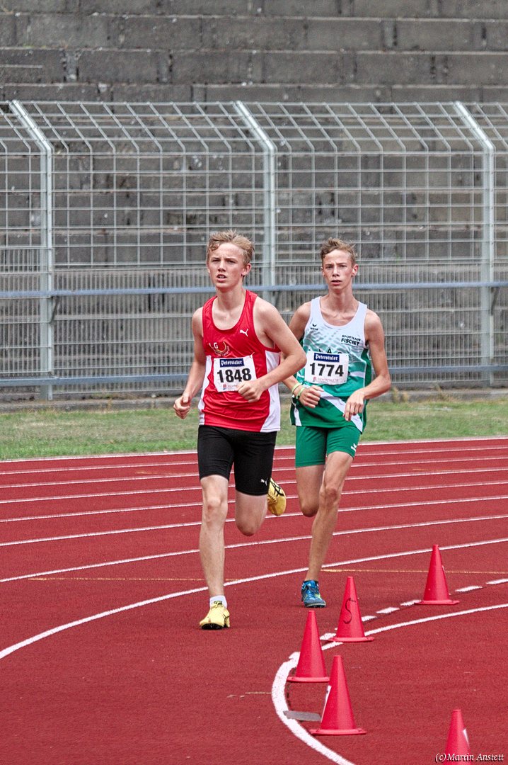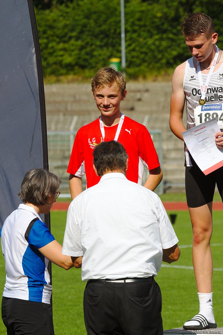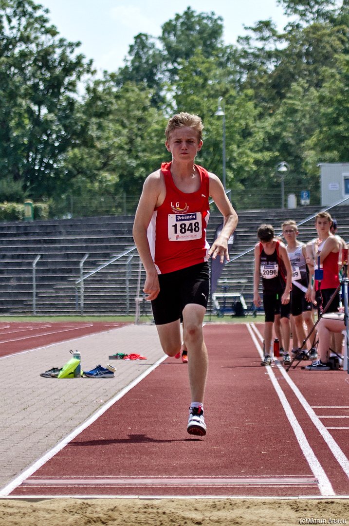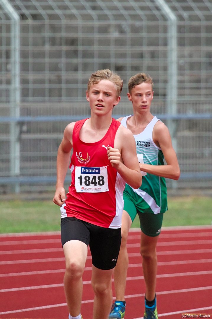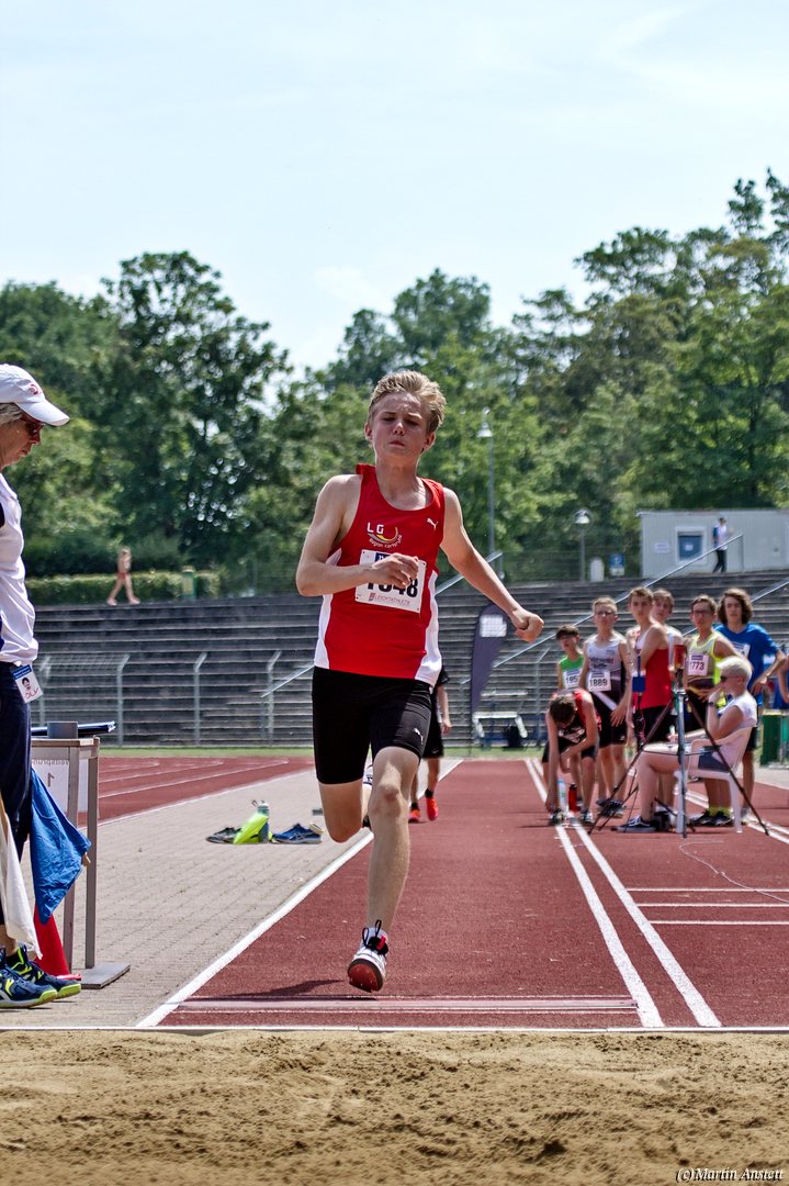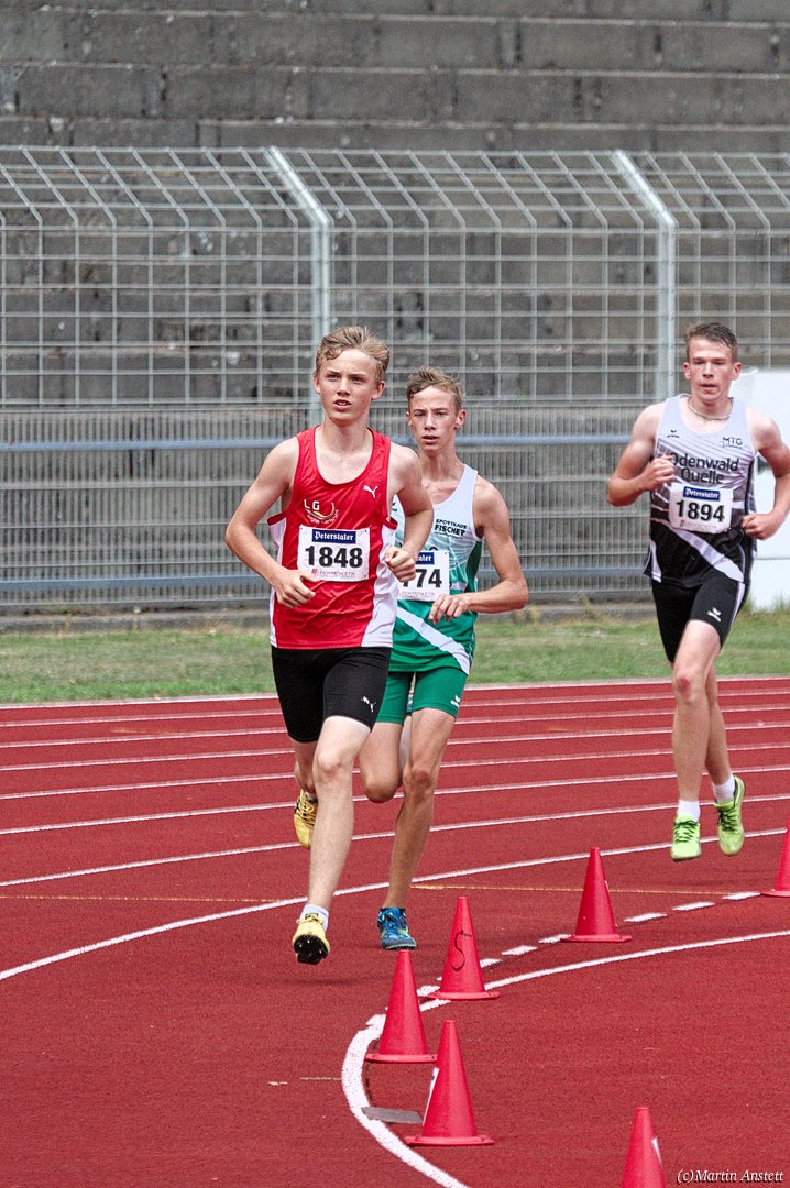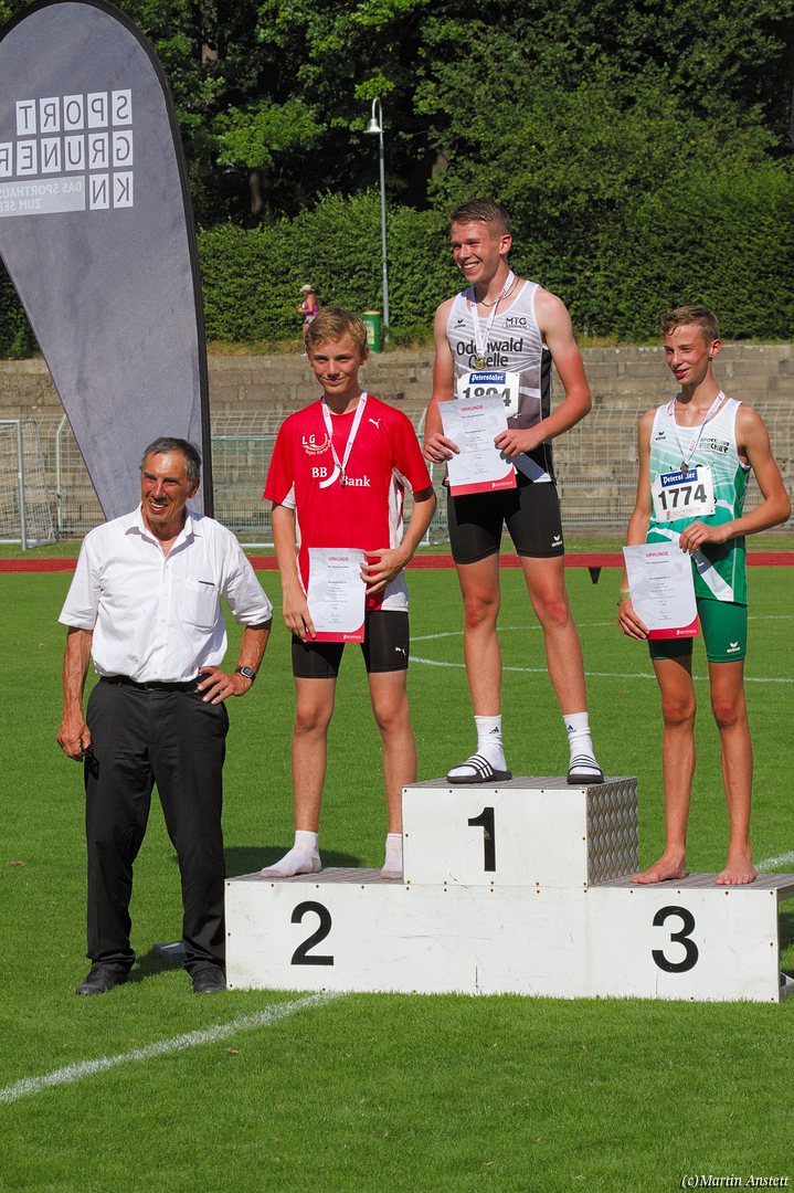 Tim lieferte gegen den sprintstarken Luca Largé der MTG Mannheim einen tollen Wettkampf, in dem er in jeder der 5 Disziplinen eine neue persönliche Bestleistung aufstellte. Ganz stark war dabei seine Zeit über die 80m Hürden (12,28sec), sowie die im Alleingang von der Spitze weg gelaufenen 6:44,20min über die abschliessenden 2000m. Am Ende eines in jeder Hinsicht heißen Tages bedeutete das 2.460 Punkte und die Silbermedaille im Blockwettkampf Lauf der M14.