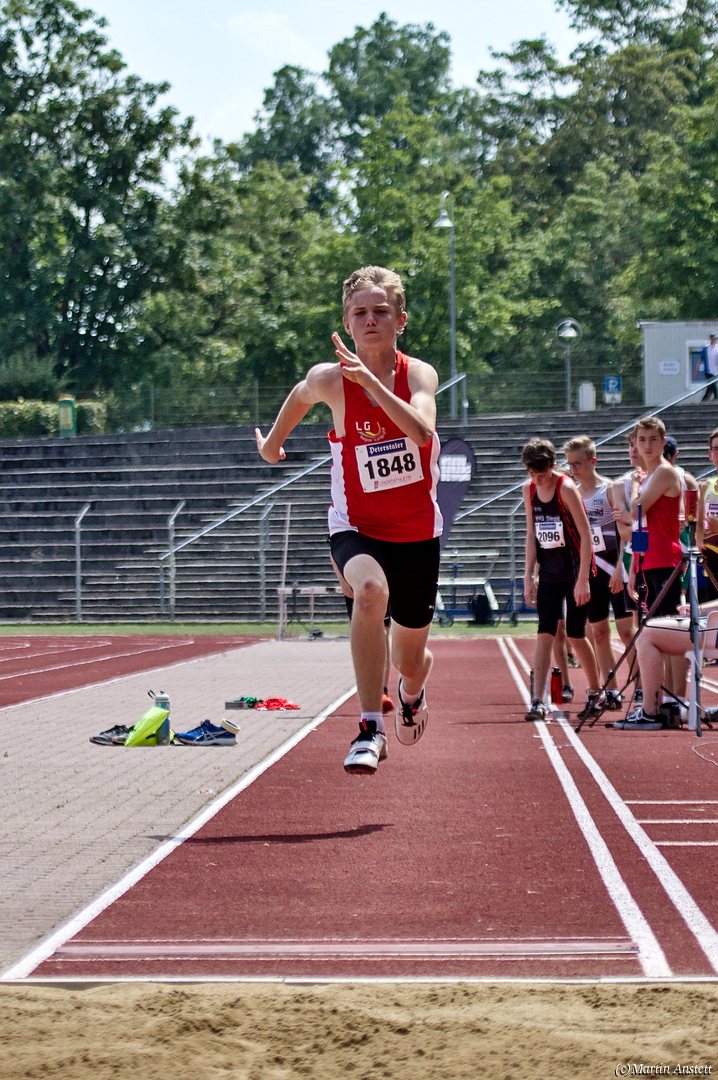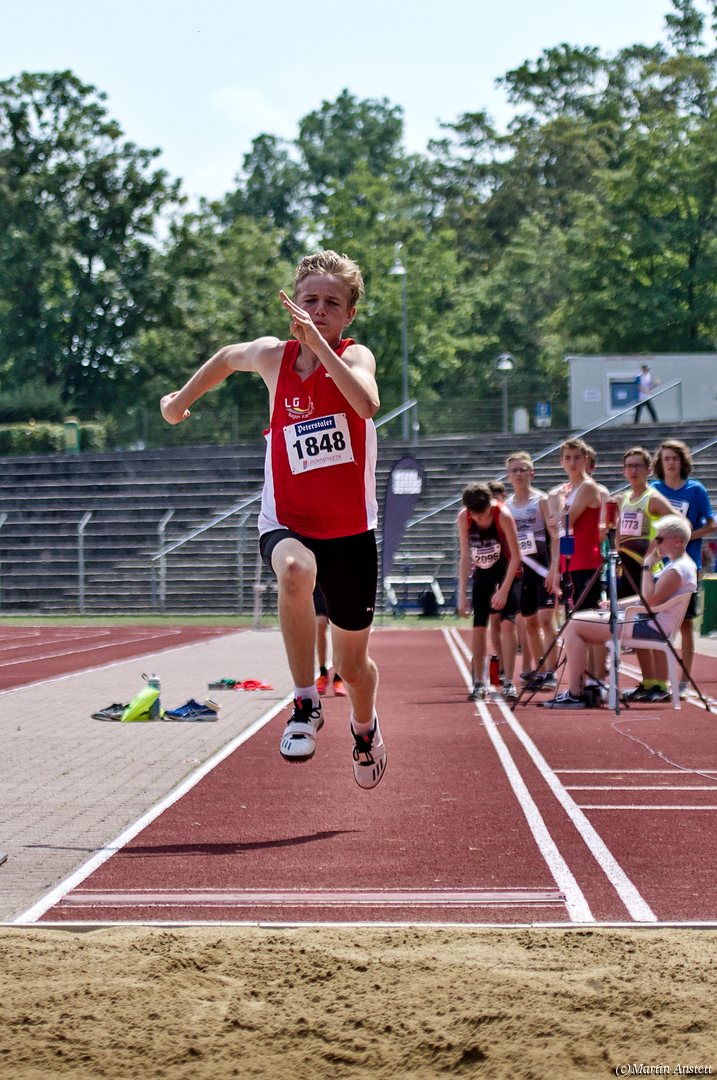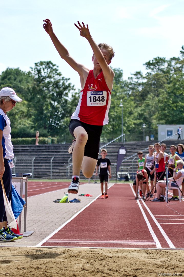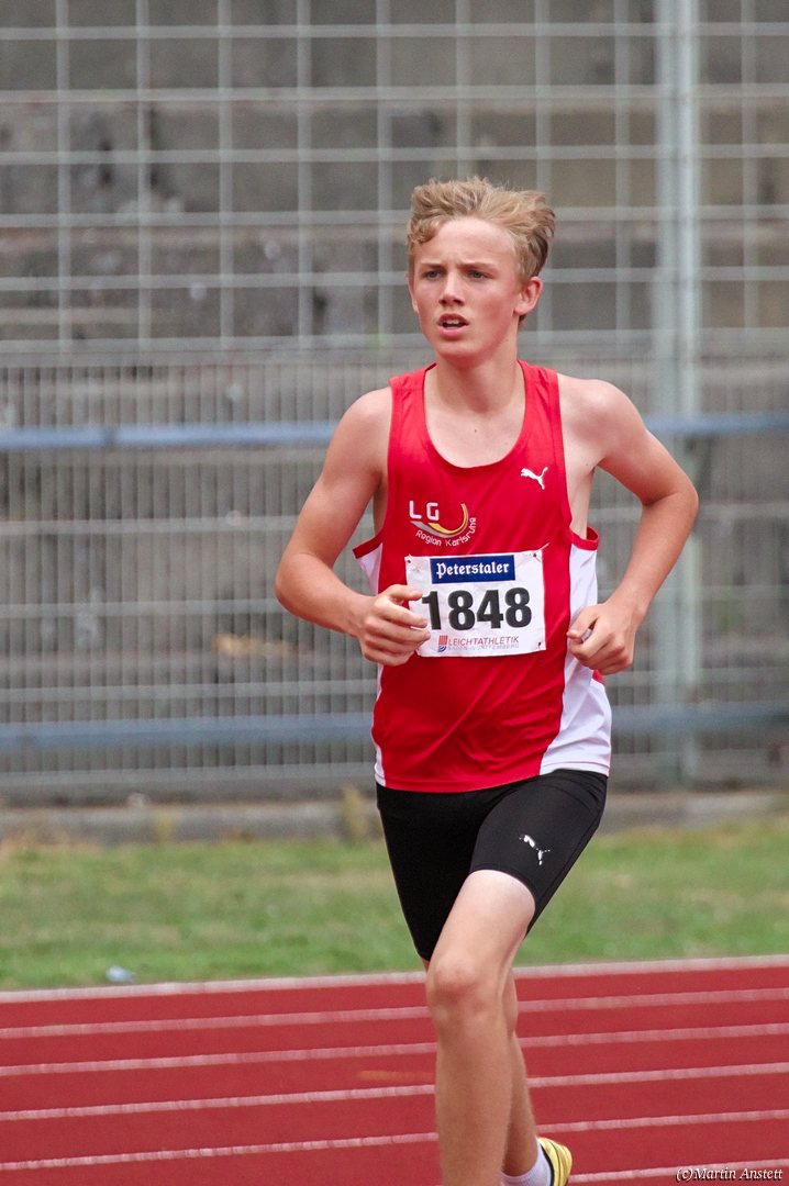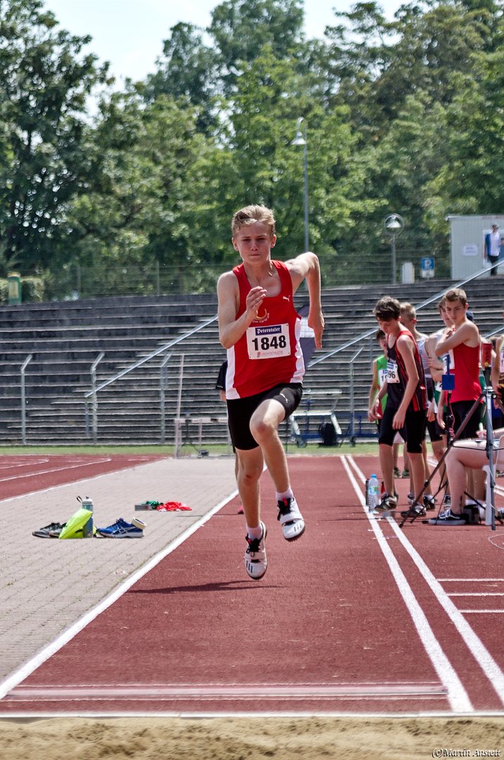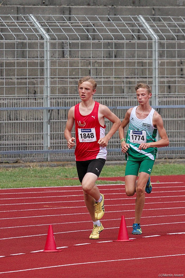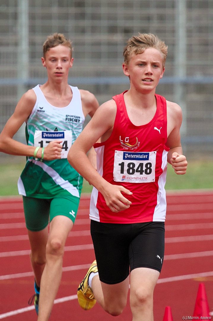 Tim lieferte gegen den sprintstarken Luca Largé der MTG Mannheim einen tollen Wettkampf, in dem er in jeder der 5 Disziplinen eine neue persönliche Bestleistung aufstellte. Ganz stark war dabei seine Zeit über die 80m Hürden (12,28sec), sowie die im Alleingang von der Spitze weg gelaufenen 6:44,20min über die abschliessenden 2000m. Am Ende eines in jeder Hinsicht heißen Tages bedeutete das 2.460 Punkte und die Silbermedaille im Blockwettkampf Lauf der M14.