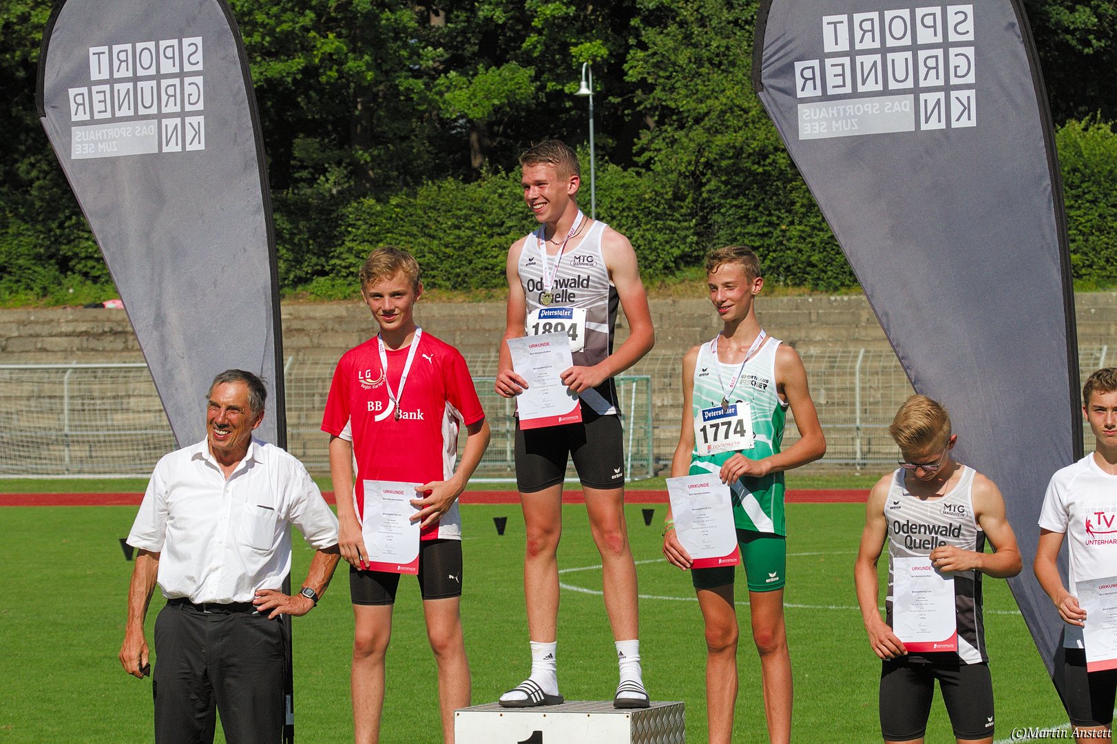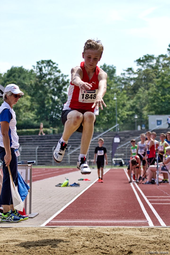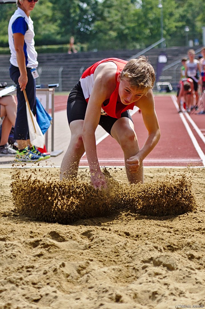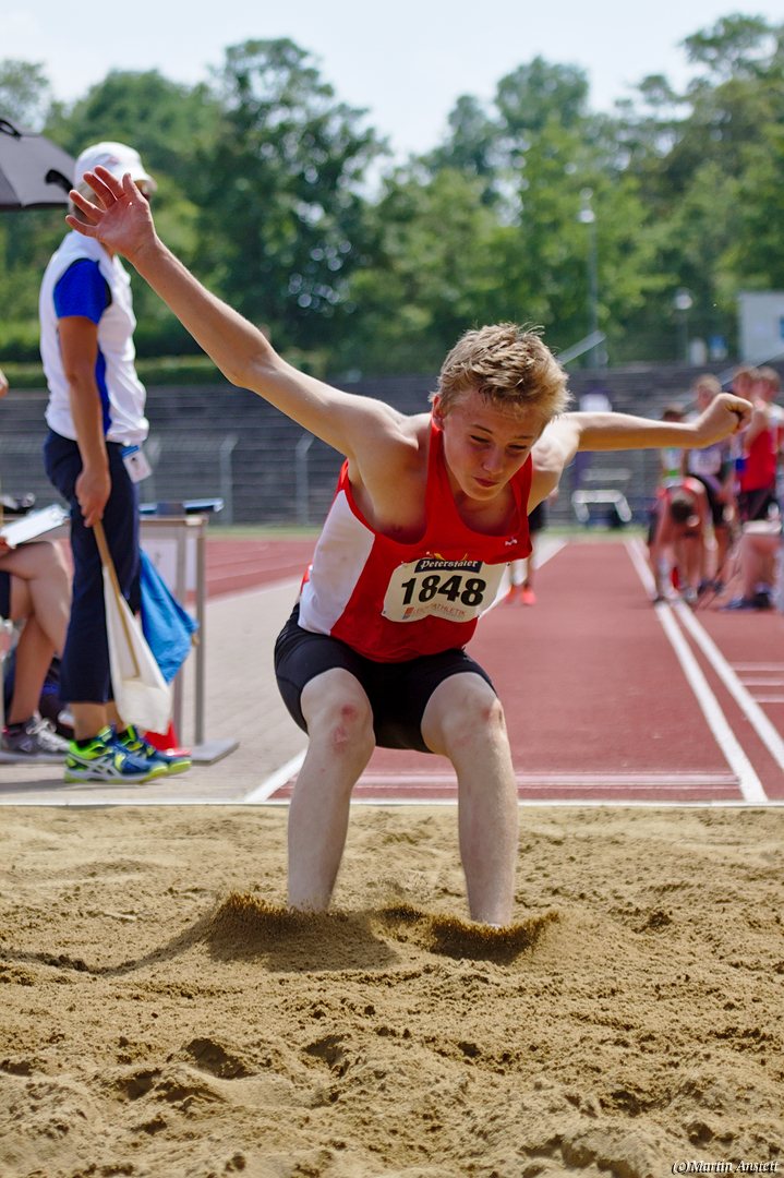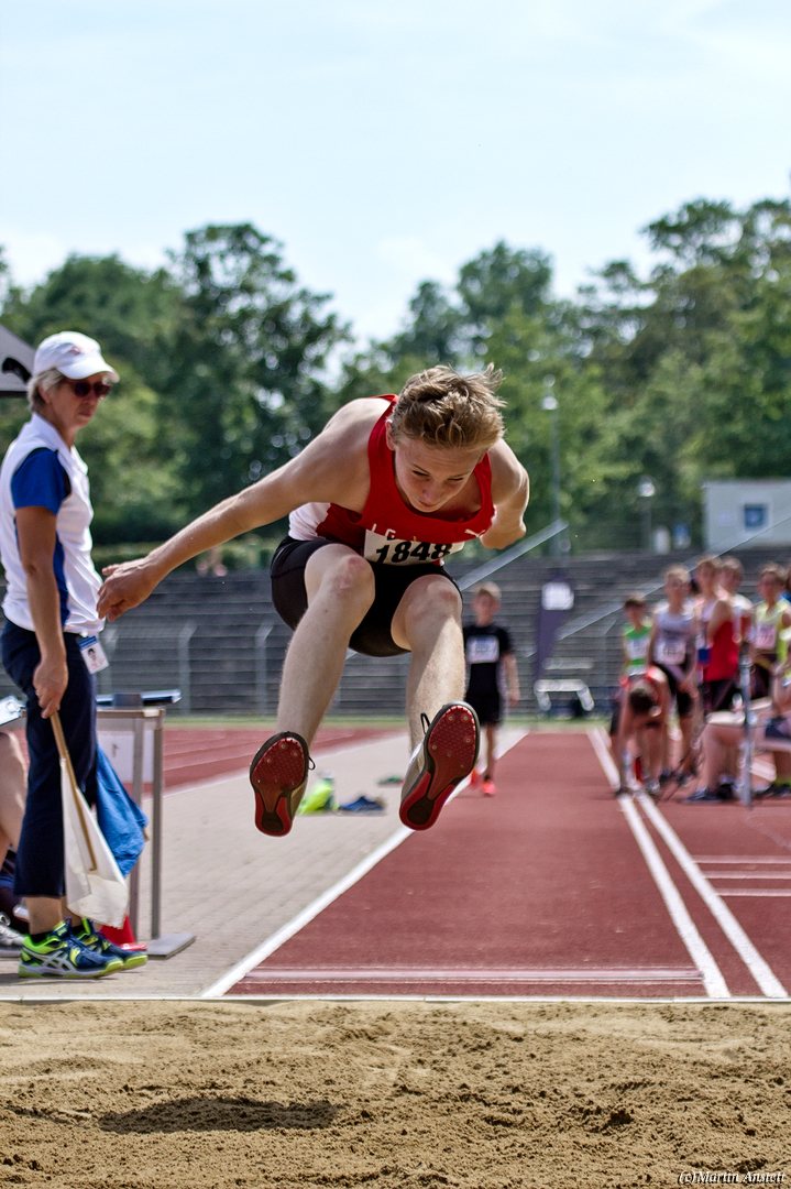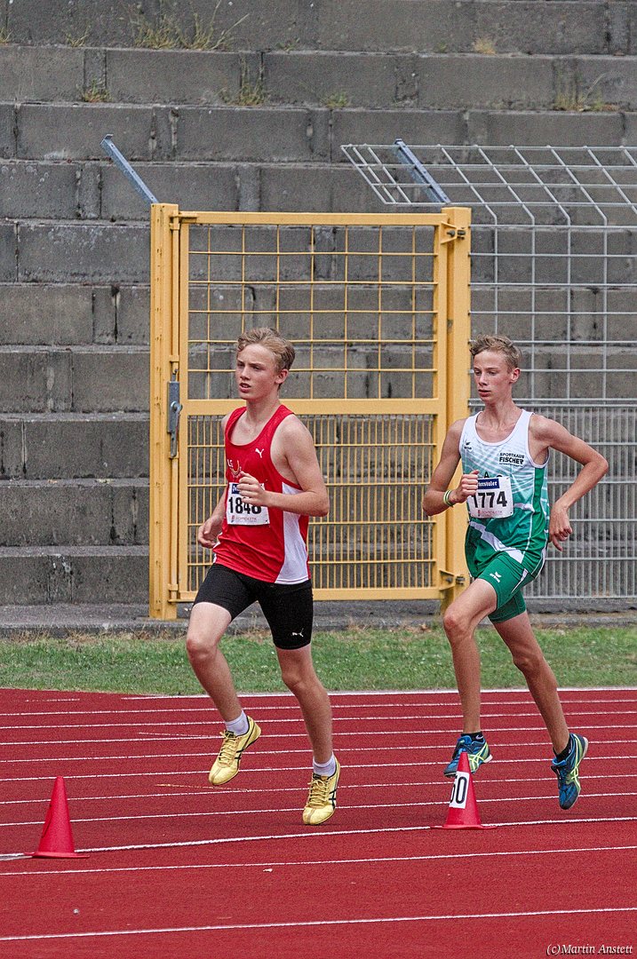 Tim lieferte gegen den sprintstarken Luca Largé der MTG Mannheim einen tollen Wettkampf, in dem er in jeder der 5 Disziplinen eine neue persönliche Bestleistung aufstellte. Ganz stark war dabei seine Zeit über die 80m Hürden (12,28sec), sowie die im Alleingang von der Spitze weg gelaufenen 6:44,20min über die abschliessenden 2000m. Am Ende eines in jeder Hinsicht heißen Tages bedeutete das 2.460 Punkte und die Silbermedaille im Blockwettkampf Lauf der M14.